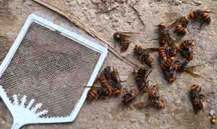 二日間に渡って巣箱の前で各1時間ほど陣取り、待ちかまえていて、ハエたたきでおよそ30匹ほどやっつけて襲撃は沈静化しました。やれやれです。